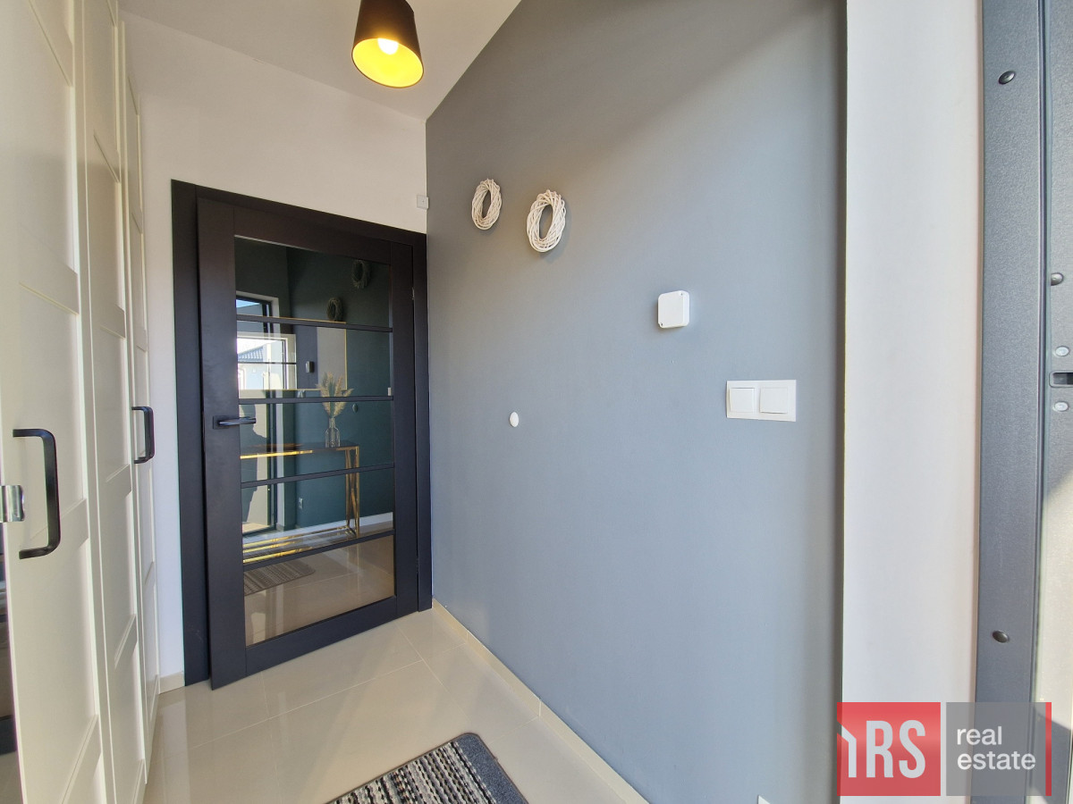 Przestronna, około 40m2 strefa dzienna - salon z aneksem kuchennym i wydzieloną częścią jadalną z wyjściem na taras (ok. 25m2), dodatkowo przy kuchni znajduje się podręczna spiżarnia, 3 sypialnie, łazienka z wanną i z kabiną prysznicową oraz oddzielne wc. Dodatkowa powierzchnia jaką jest poddasze stanowi doskonale miejsce do przechowywania. W bryle budynku garaż dla jednego samochodu, a przed domem wydzielona część do zaparkowania trzech kolejnych pojazdów.
