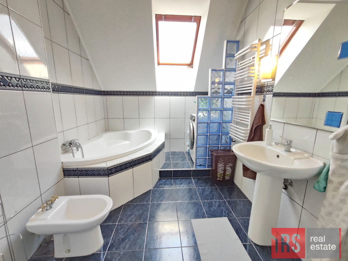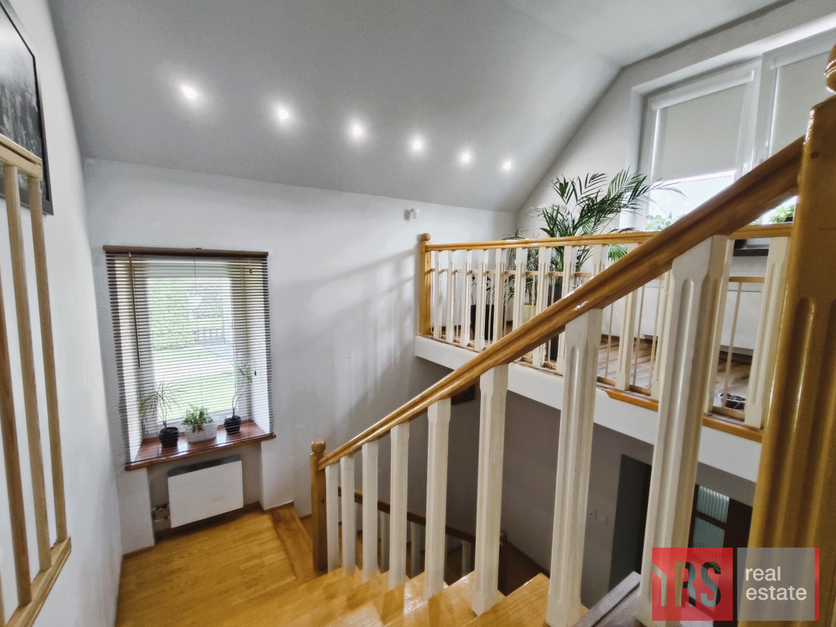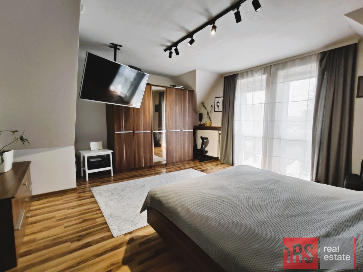 Piętro: Trzy ustawne sypialnie, każda z wyjściem na balkon, duża łazienka z wanną, loggia