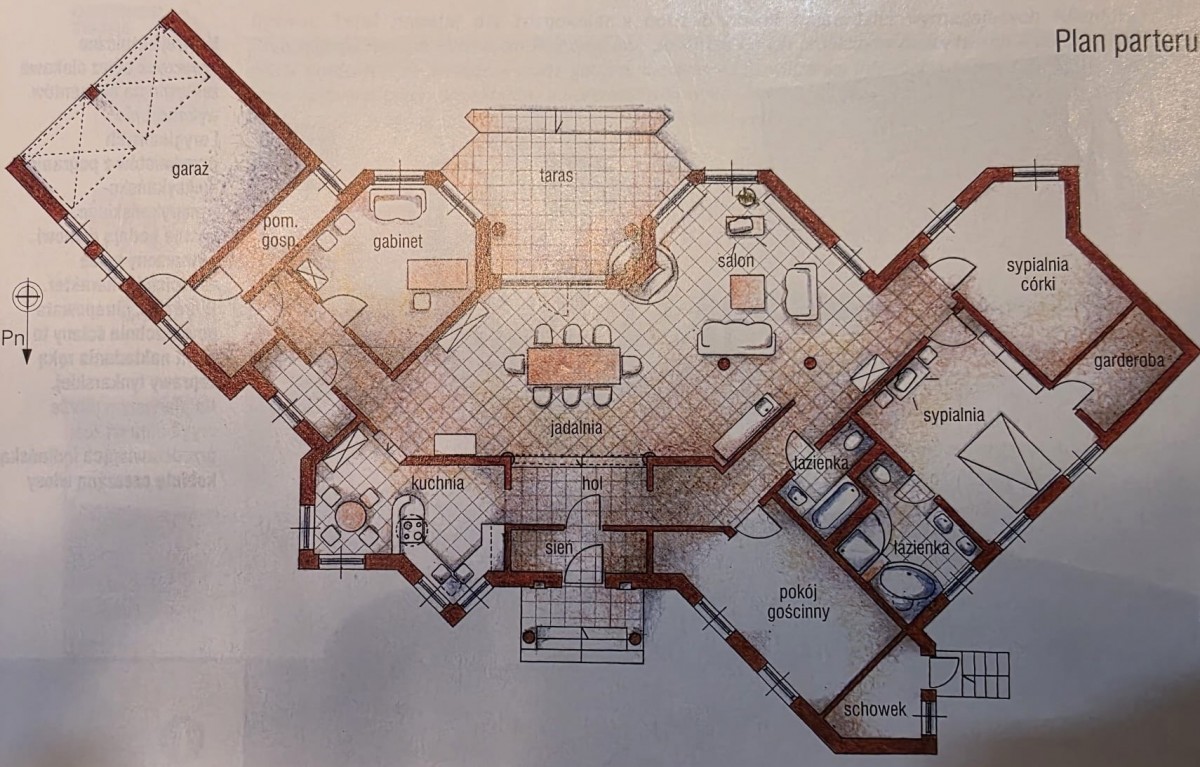 Dom parterowy o nieregularnej bryle został wybudowany w 2000 roku w stylu Santa Fe z Nowego Meksyku. Architektura i wykończenie wnętrz tworzą unikalny klimat - zastosowano naturalne materiały, drewniane belki, ozdobne tynki, meksykańskie płytki i oryginalne meble.