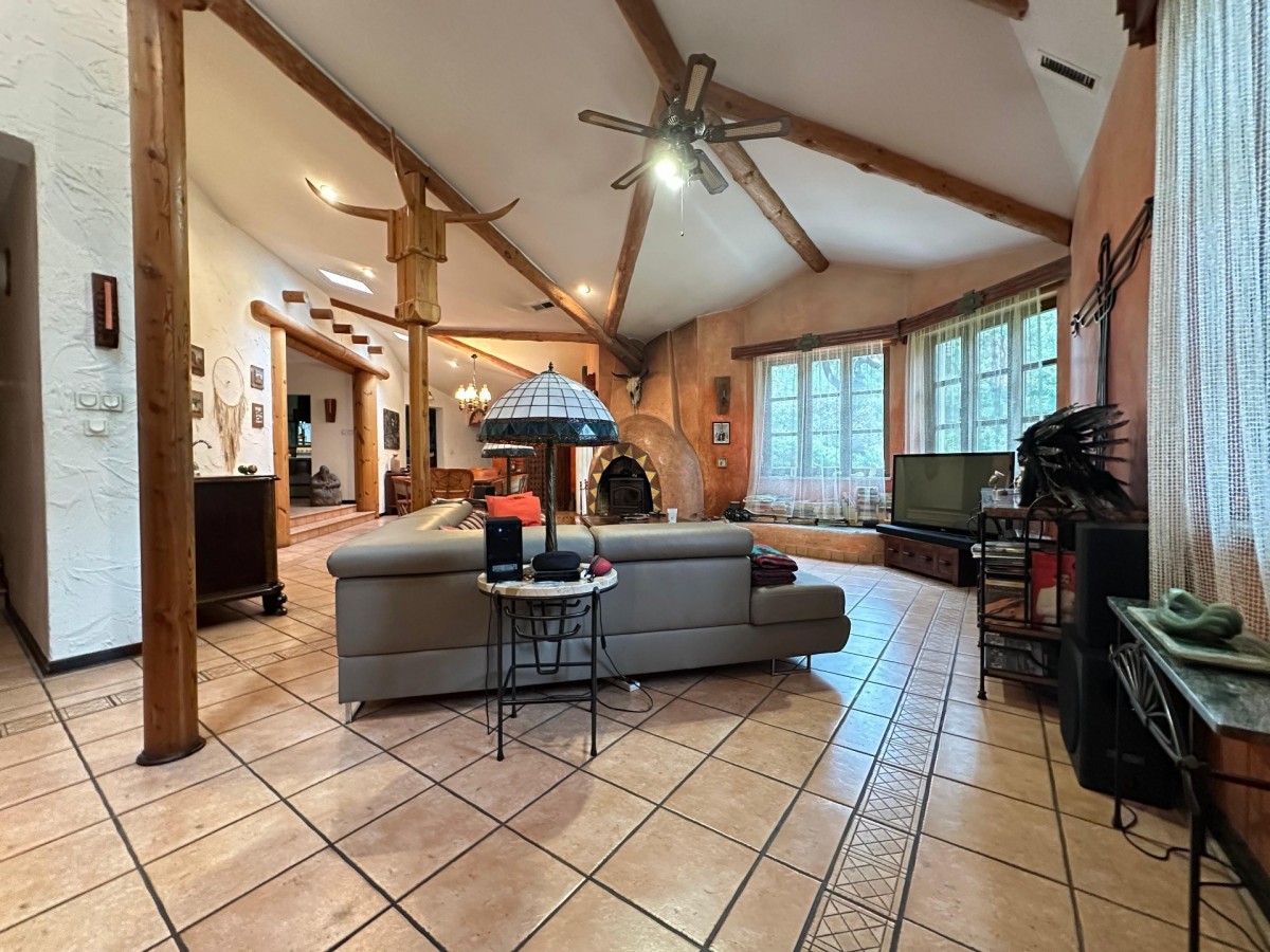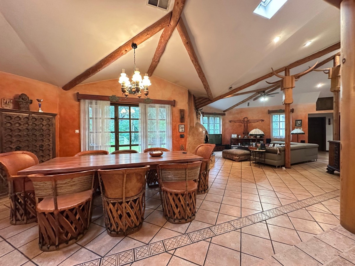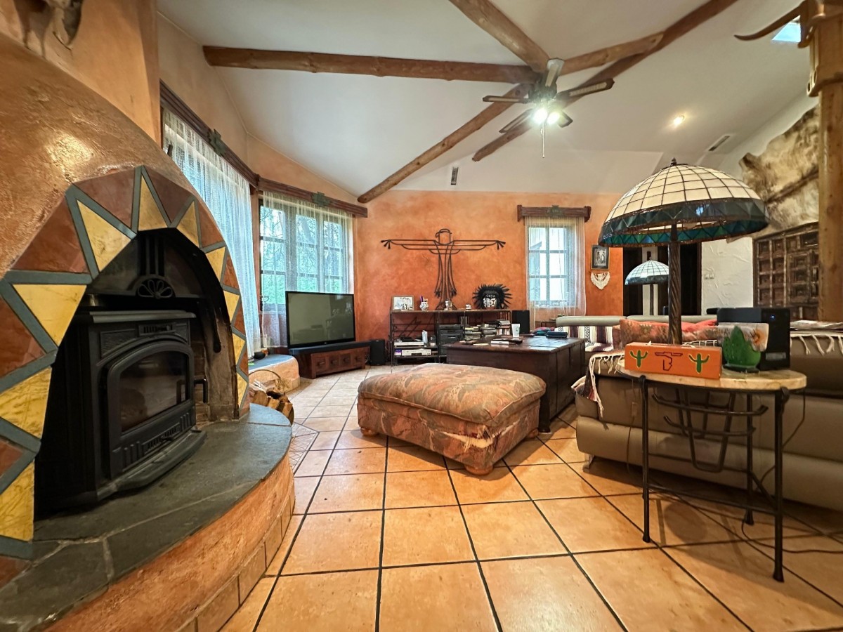 reprezentacyjny salon z kominkiem w stylu Santa Fe, dużymi przeszkleniami i wyjściem na taras (okna i taras wychodzą na wschód, zapewniając piękne poranne światło),