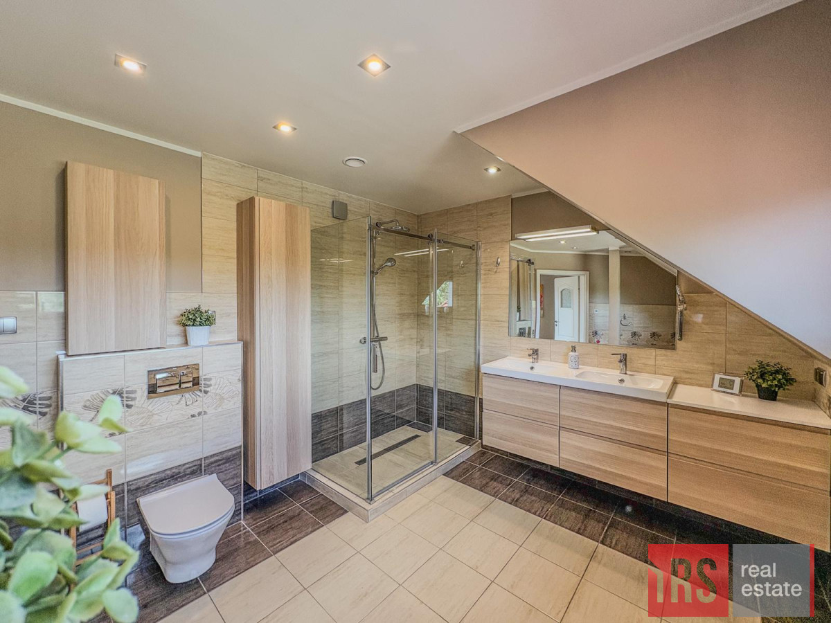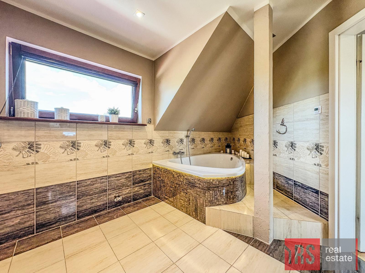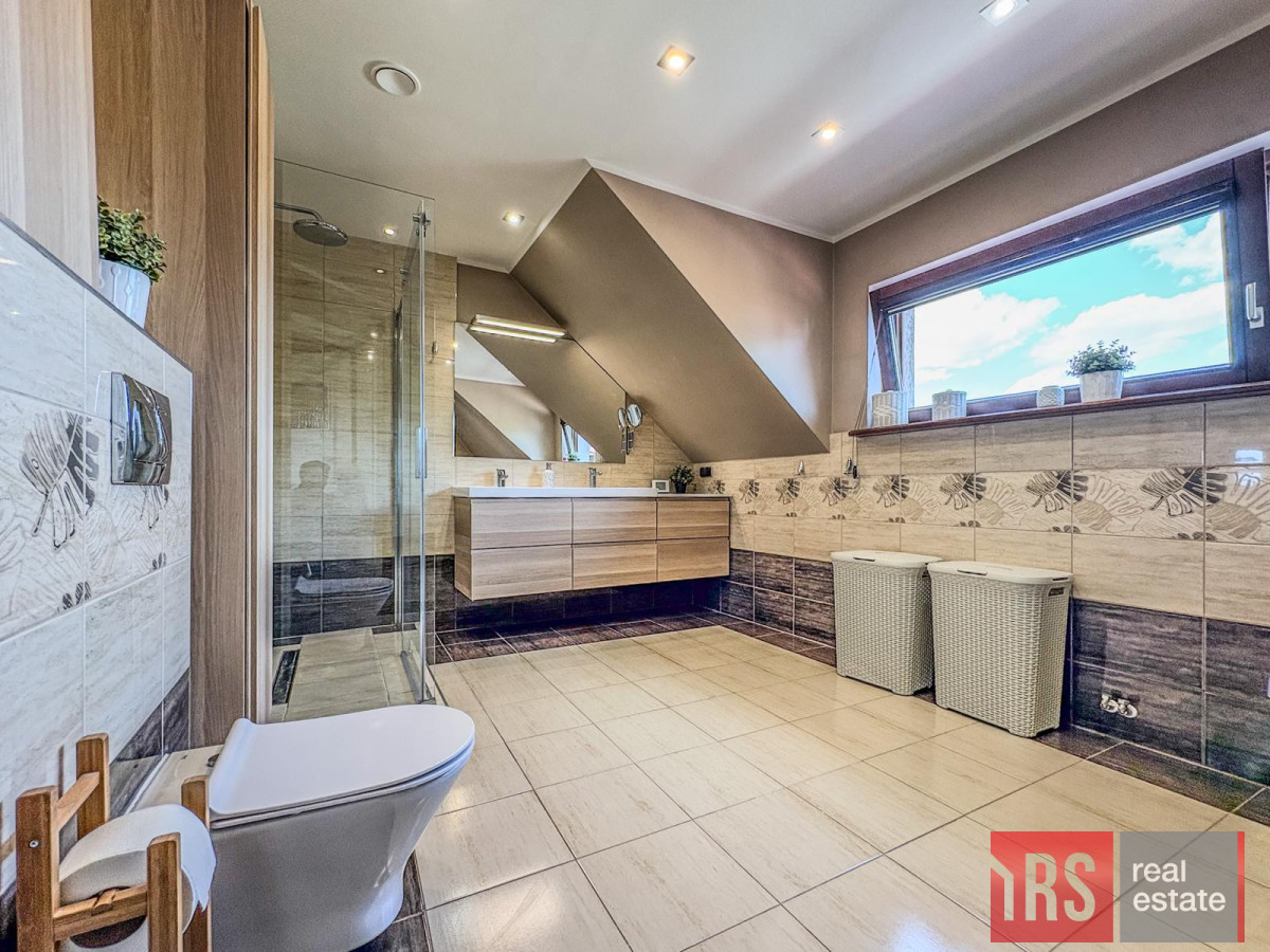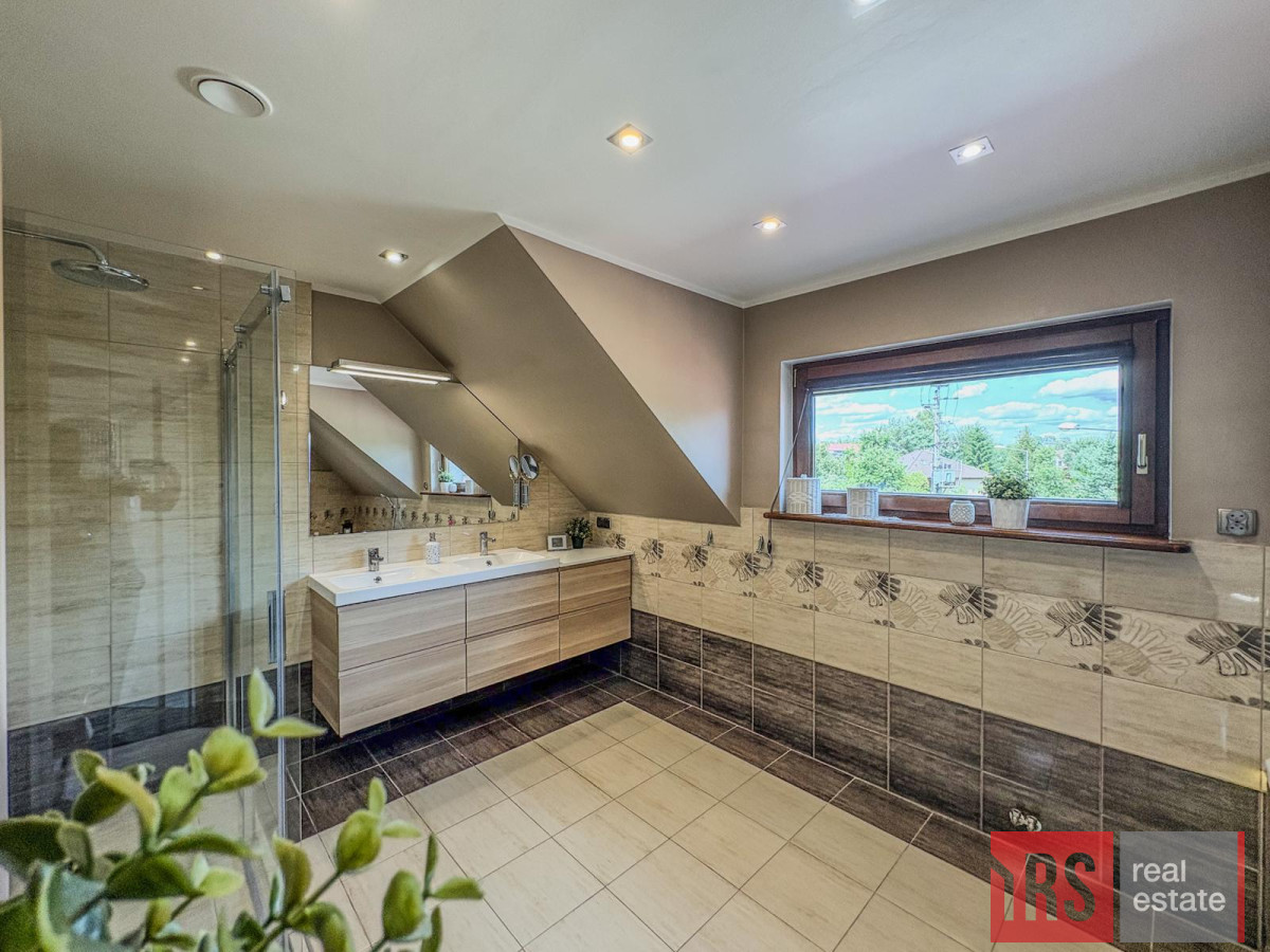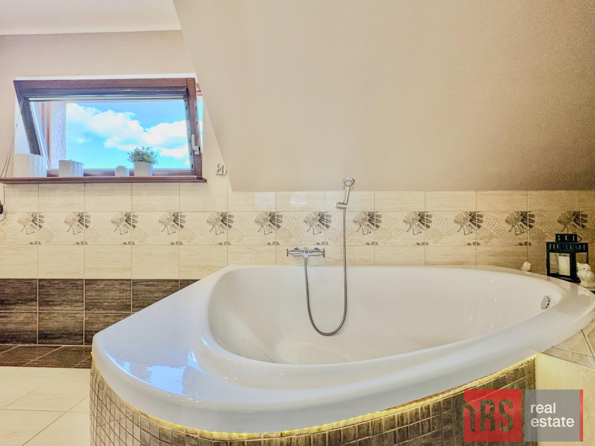 - pokój kąpielowy na piętrze (duża wanna, duża kabina prysznicowa, umywalka dwustanowiskowa)
