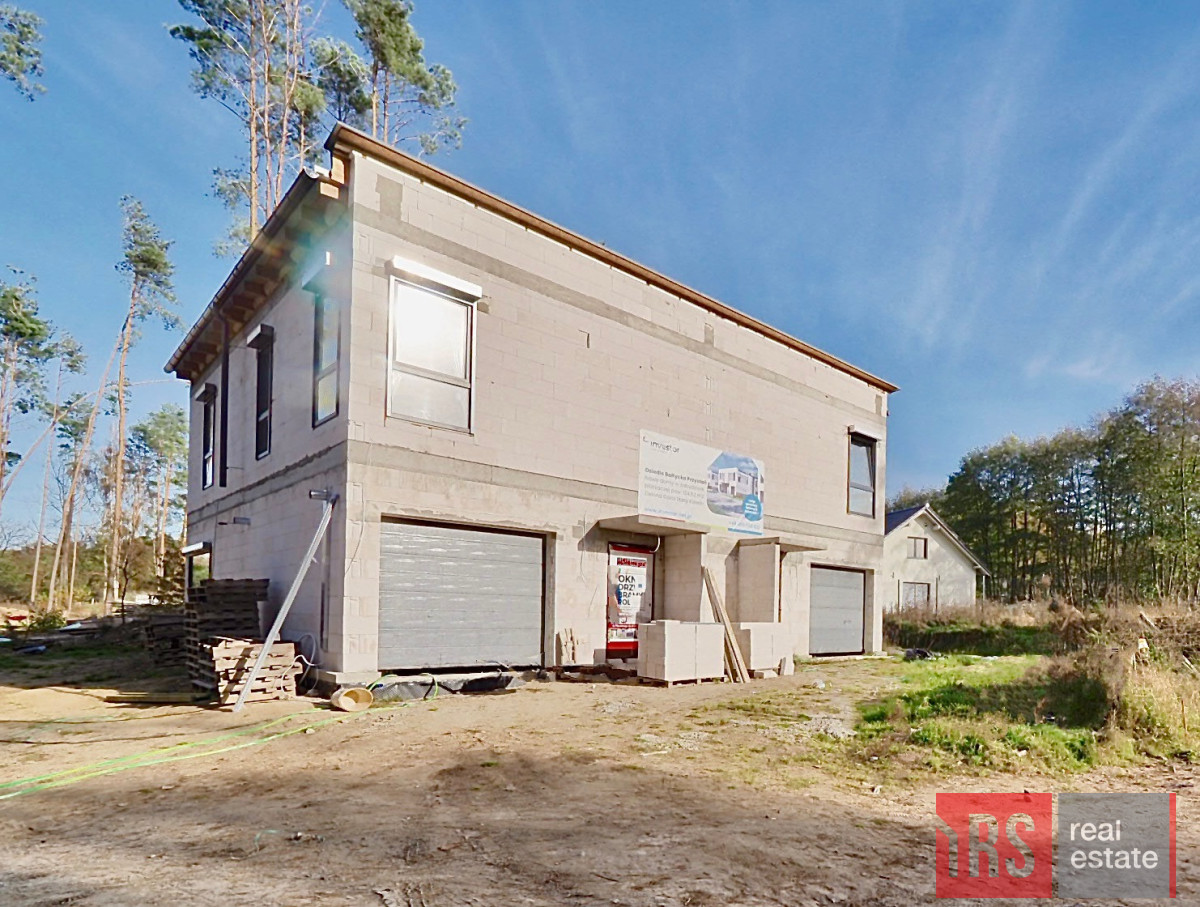 Okna z roletami, garaż w bryle budynku oraz ogrodzenie dopełniają oferty, a utwardzona droga dojazdowa zapewnia łatwy dostęp do posesji.