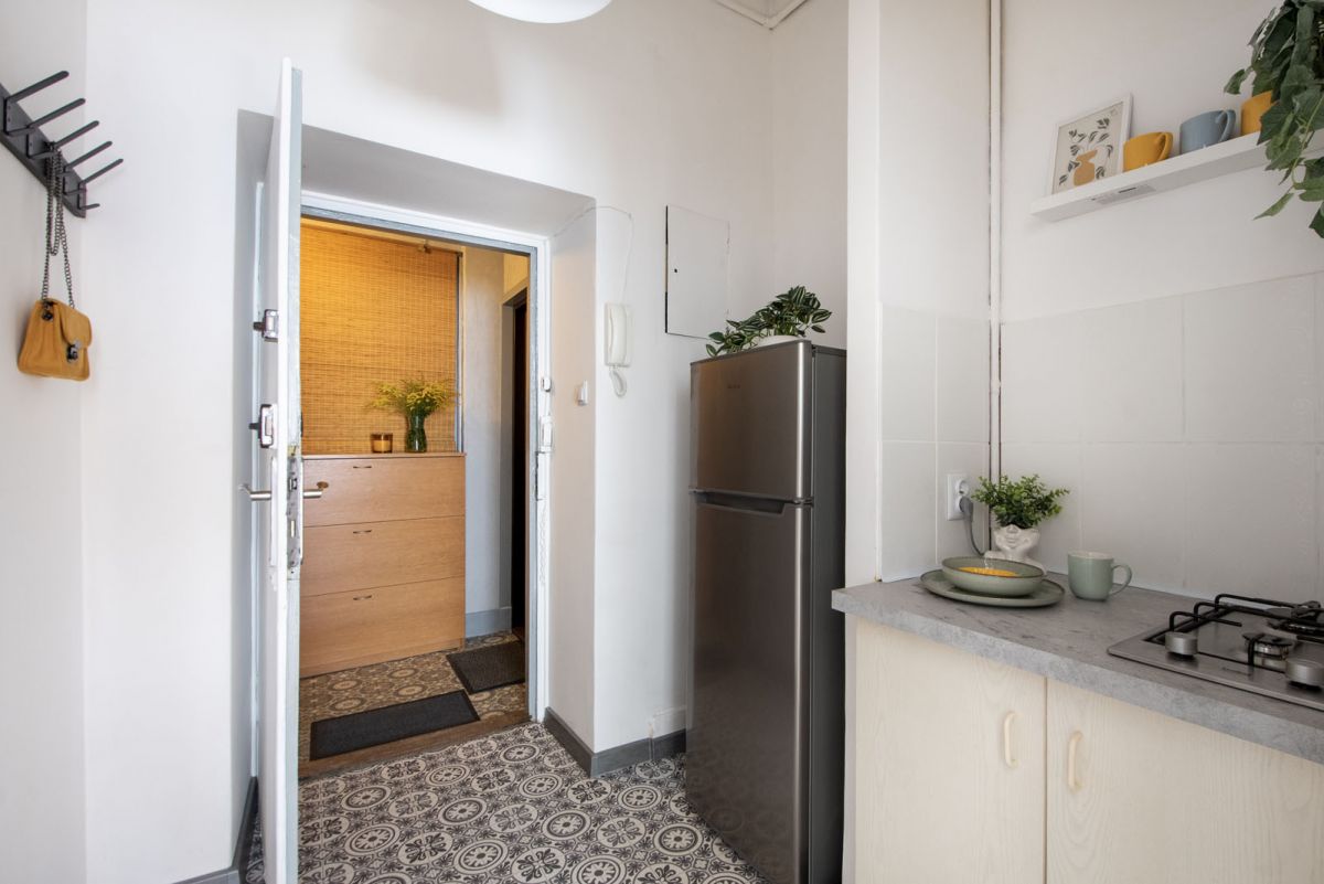 Do mieszkania wchodzi się z zamykanego przedsionka, który stanowi część wspólną dla jeszcze jednego lokalu.
