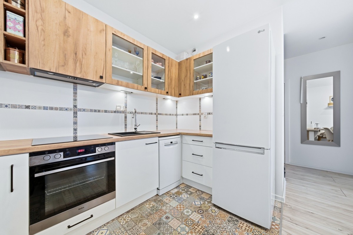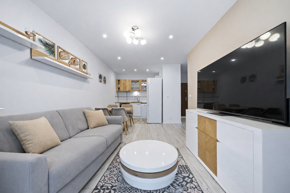 Mieszkanie składa się z salonu z aneksem kuchennym i wyjściem na balkon, przestronnej sypialni z zabudowanymi szafami, łazienki z prysznicem walk in oraz korytarza z pojemną szafą w zabudowie. Układ zapewnia wygodne korzystanie z przestrzeni i dobre możliwości przechowywania.