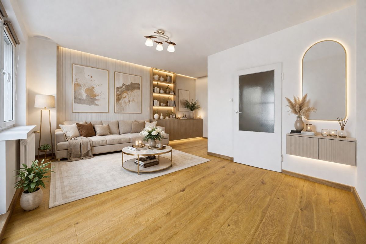 Pierwsze pięć zdjęć przedstawia przykładowe wizualizacje, reszta to stan faktyczny lokalu.