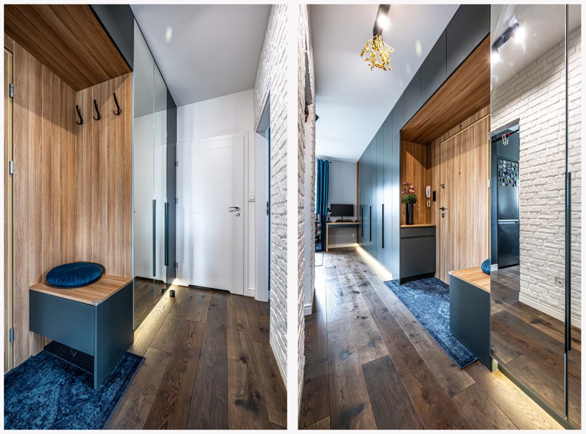 • Pojemne zabudowy na wymiar w sypialni, pokoju i przedpokoju z oświetleniem LED przy podłodze.