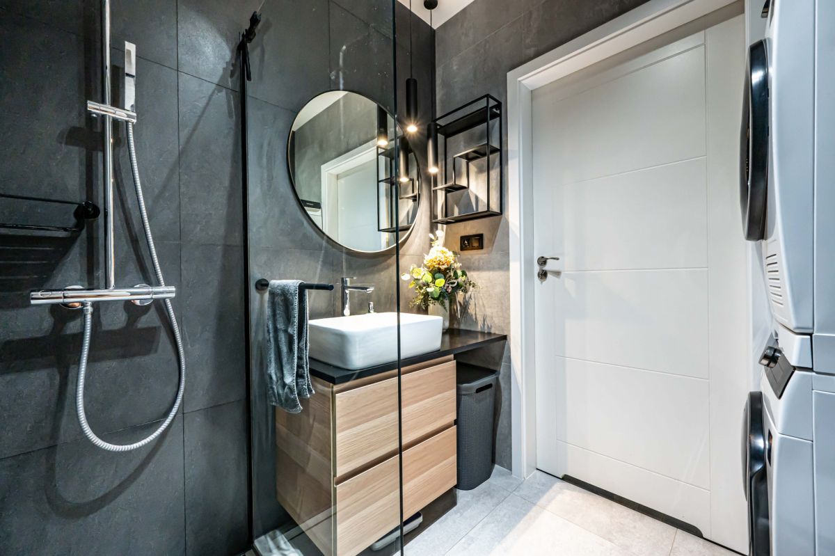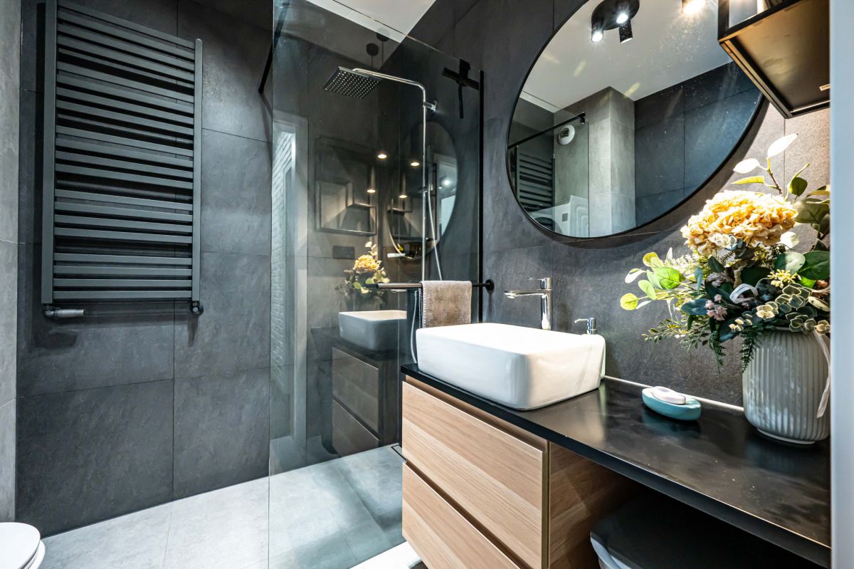 - Łazienka z prysznicem walk-in - komfort i nowoczesny design.