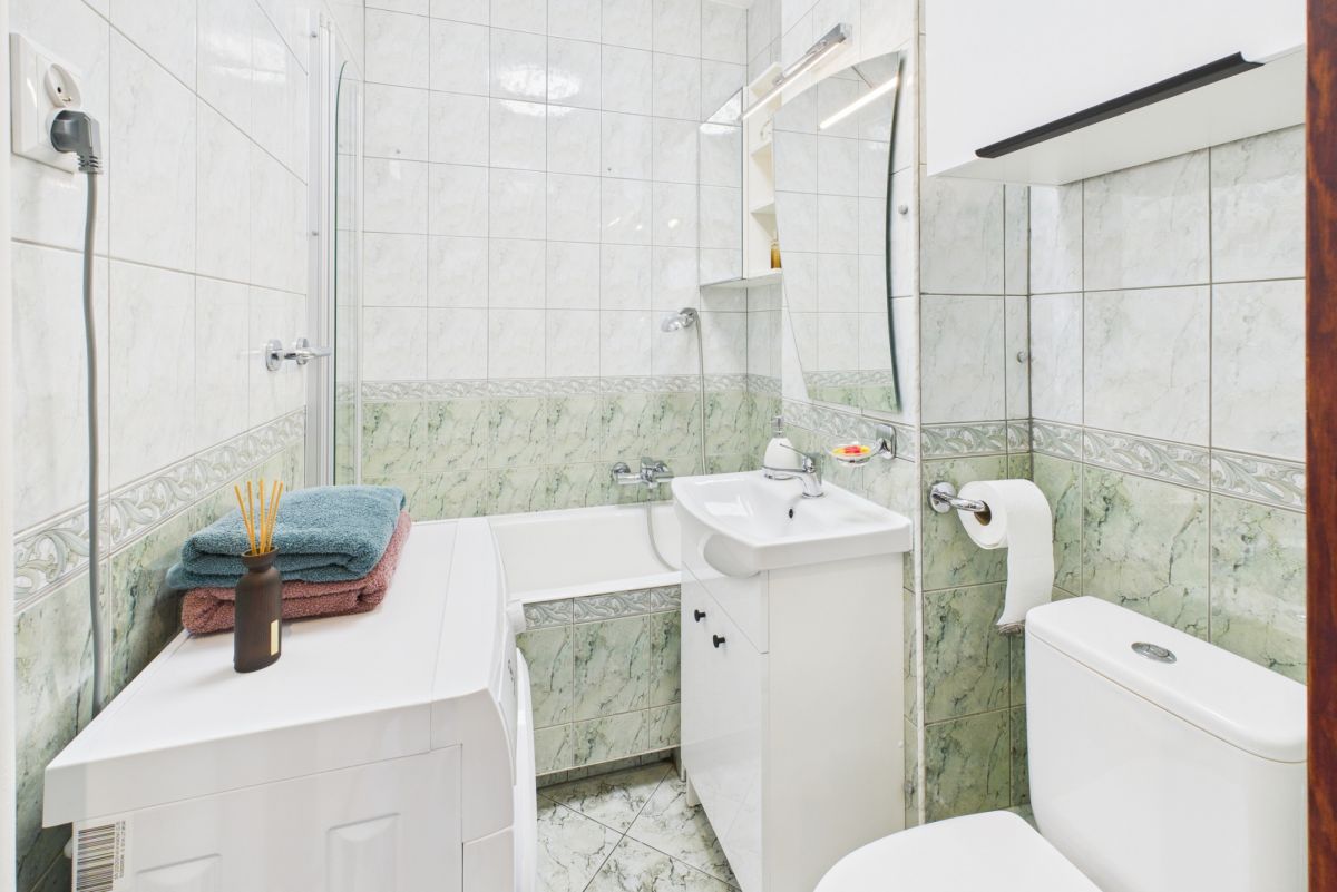 W łazience wanna z parawanem prysznicowym, umywalka z szafką, toaleta i nowa pralka.
