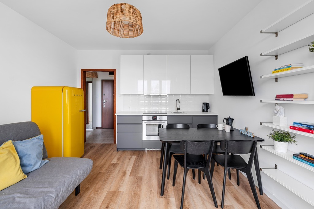 - Salon z aneksem kuchennym - 16 m², z nowoczesną zabudową, pełnym AGD