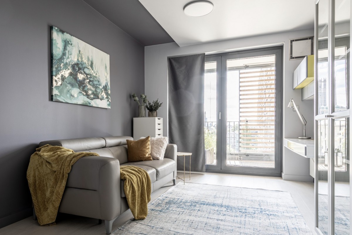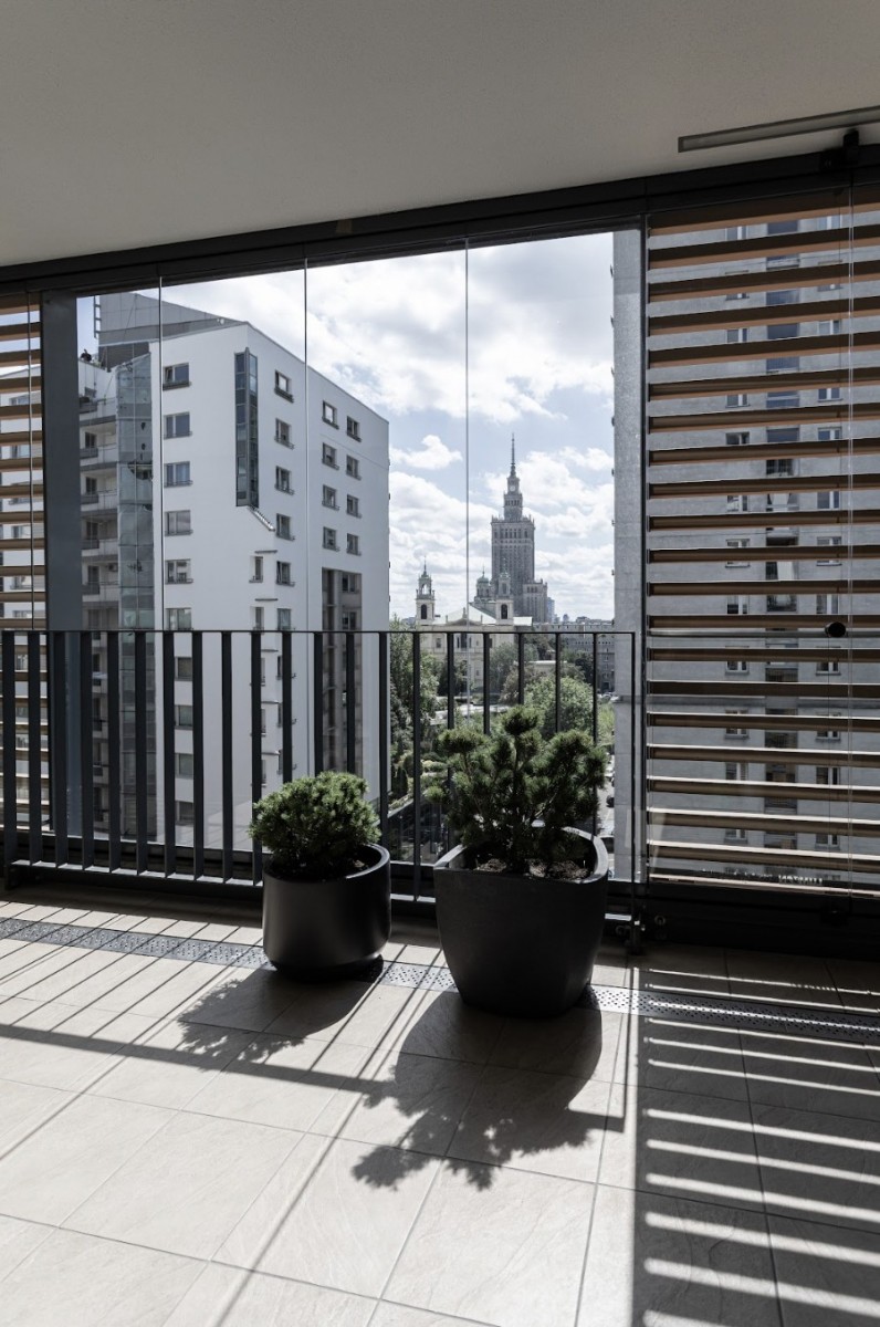The apartment is fully furnished and equipped to a high standard. The bright, well-lit interiors with large windows offer a beautiful view of the city panorama and the iconic Palace of Culture, giving the entire space a unique character.