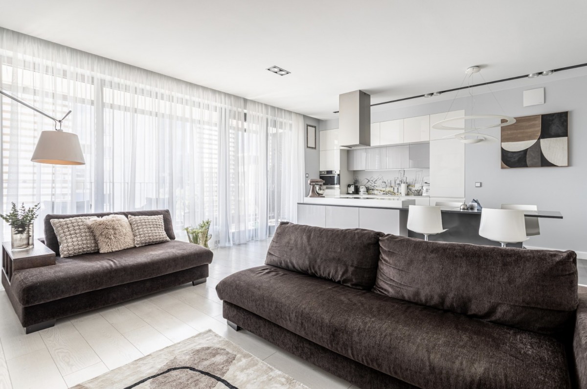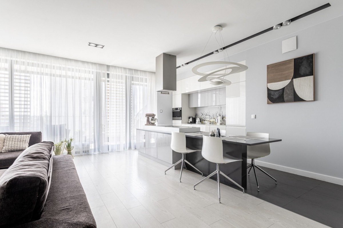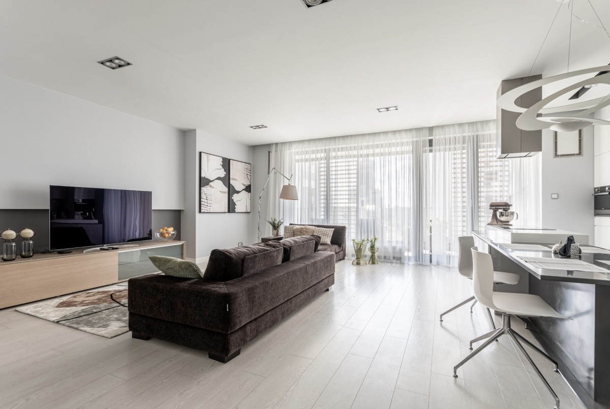 • przestronnego salonu z jadalnią i otwartą kuchnią, z ekspozycją południową i widokiem na Pałac Kultury,