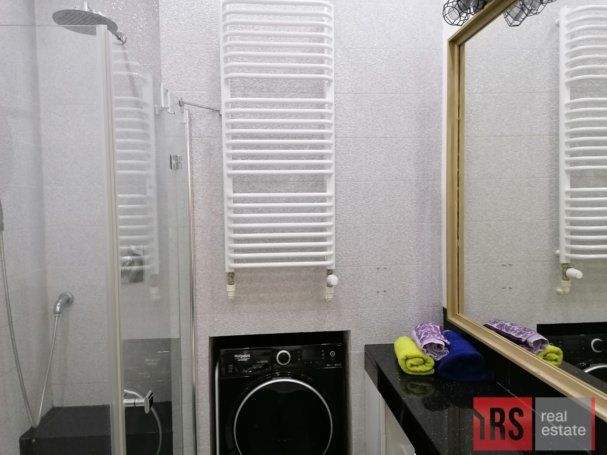 Łazienka: Nowoczesna, z komfortową kabiną prysznicową i WC, pralka.