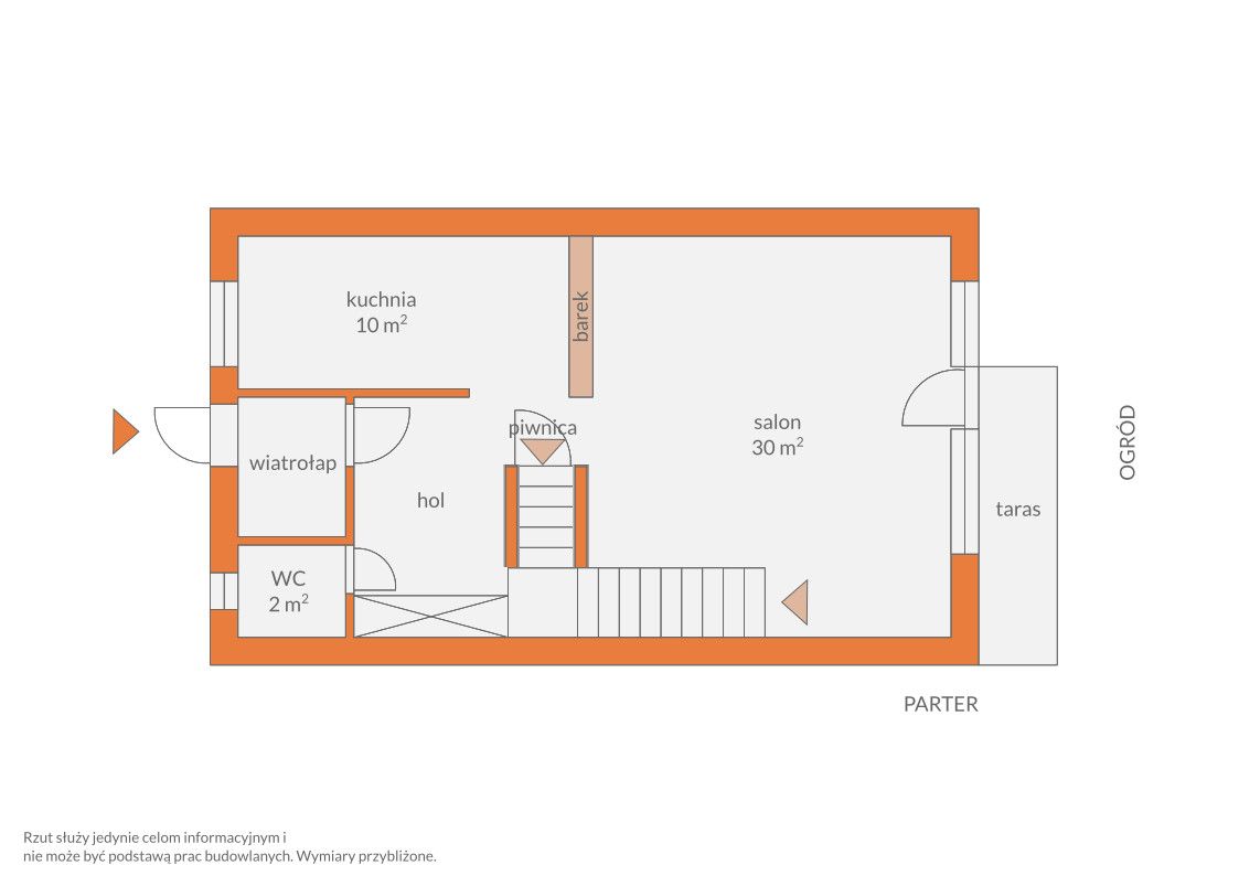 Na parterze o powierzchni 59 m2 jest następujący rozkład pomieszczeń: wiatrołap, hol z szafą wnękową, salon z wyjściem na taras i zejściem do niewielkiego ogródka, półotwarta kuchnia i WC z oknem.
