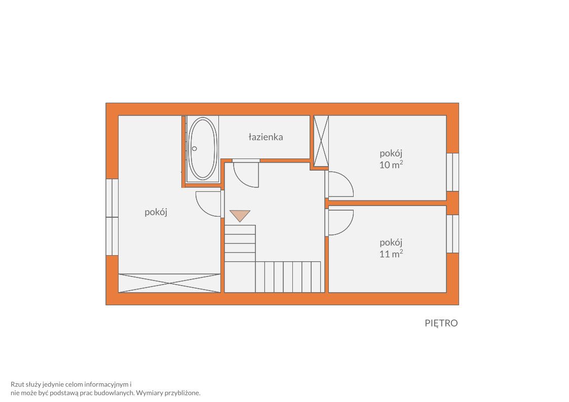 Na piętrze są 3 sypianie (2 z szafami w zabudowie) i łazienka z wanną. Poddasze może pełnić funkcję kolejnej sypialni lub gabinetu.