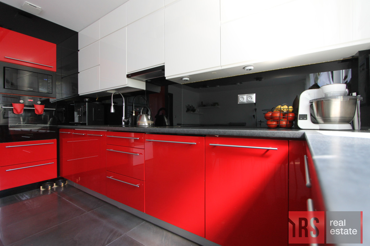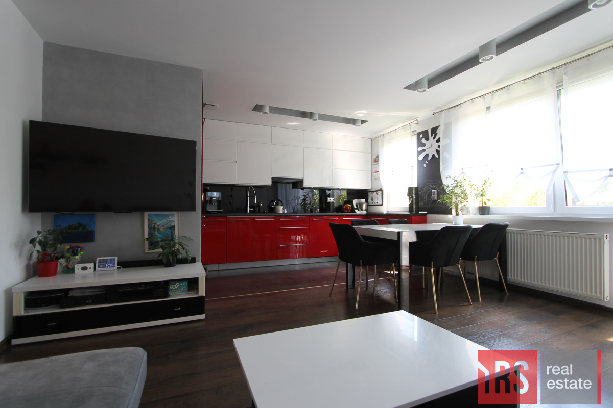 Mieszkanie urządzone w wysokim standardzie, na ścianach gładzie, na podłogach panele i kafelki (kuchnia, przedpokój, łazienka). Kuchnia urządzona na wymiar nowoczesnymi meblami w zabudowie, połączona jest z salonem, dzięki czemu zyskano przestronny pokój dzienny, połączony z kuchnią.