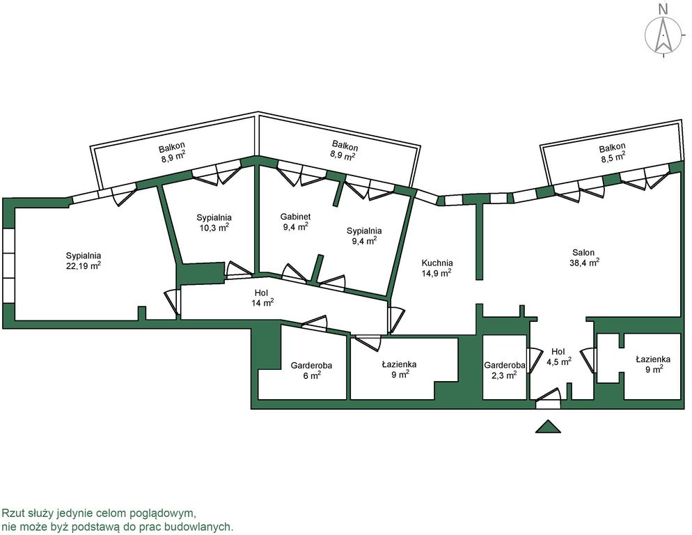 - 3 Sypialnie – 22,19 m², 10,3 m², 9,4 m² - sypialnie z wyjściem na 2 balkony po 8,9 m²