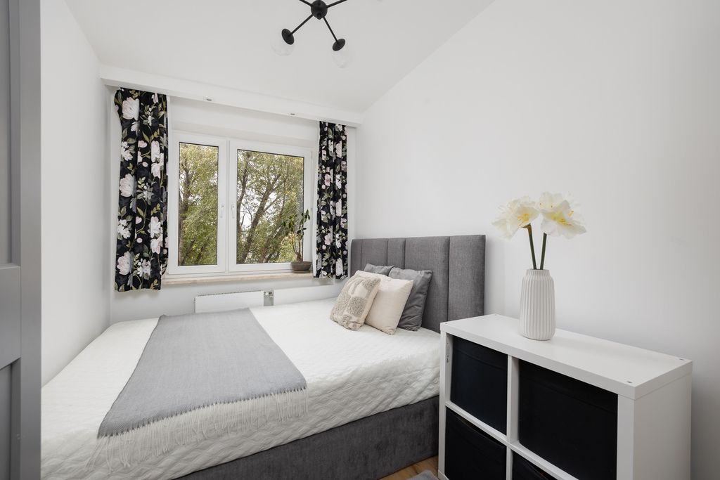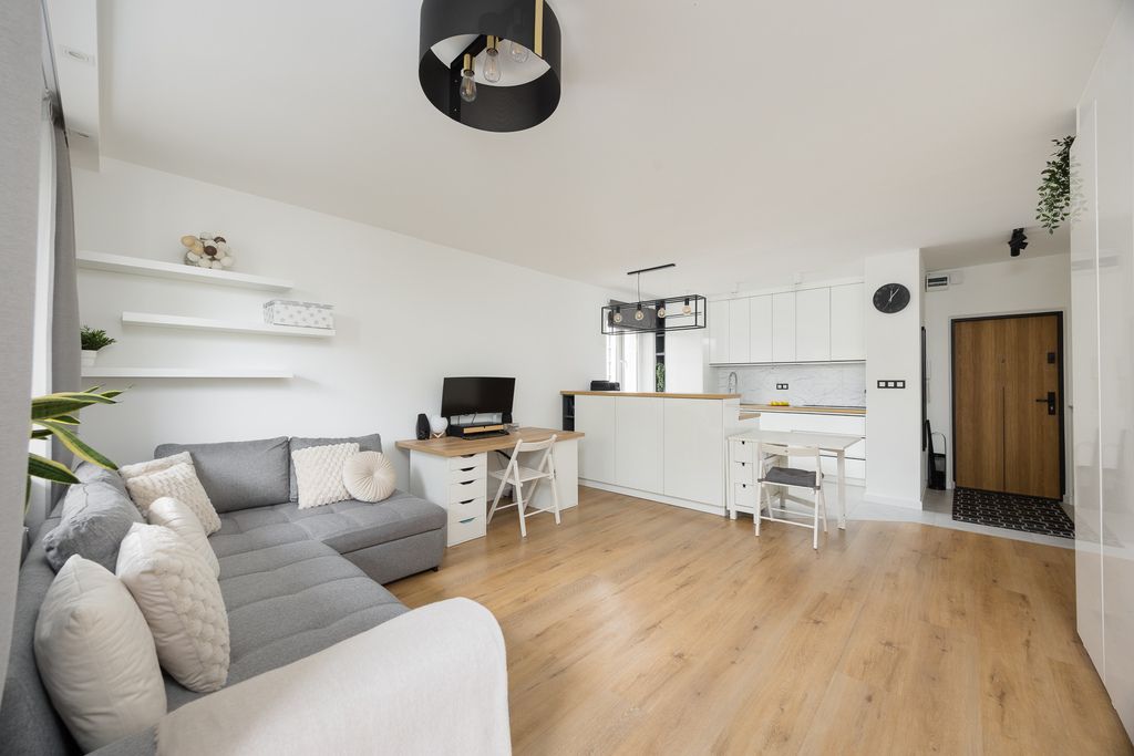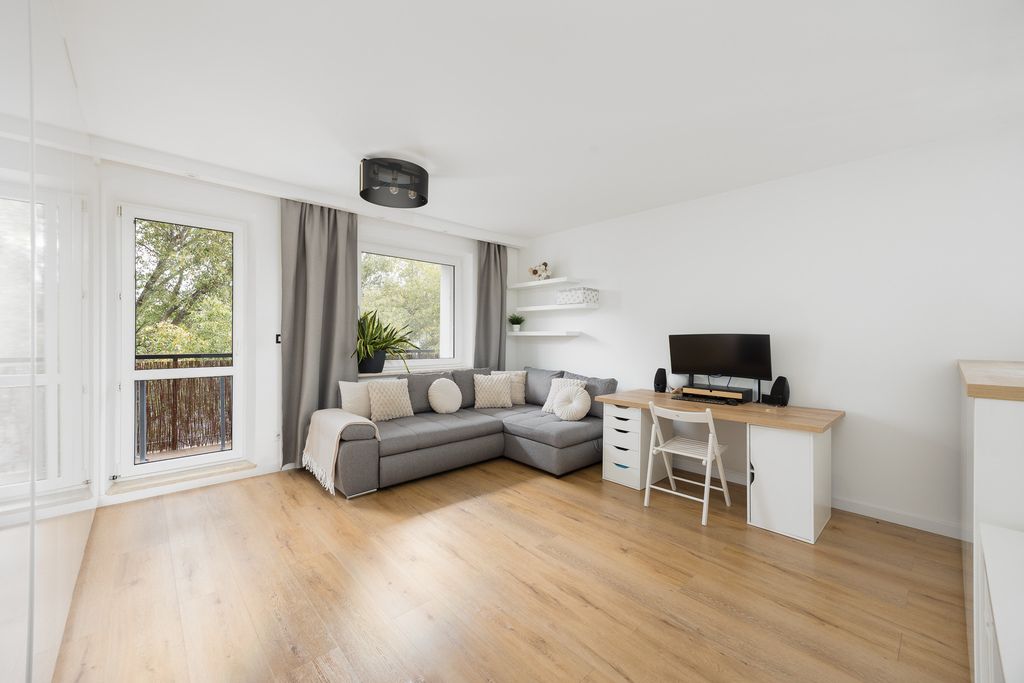 Mieszkanie przeszło generalny remont w 2022 roku. Wnętrze zostało zaprojektowane w nowoczesnym stylu, co sprawia, że mieszkanie jest gotowe do wprowadzenia bez dodatkowych nakładów. Kuchnia jest w pełni wyposażona w sprzęty AGD, m.in.: zmywarkę, lodówkę z zamrażarką, płytę grzewczą, mikrofalówkę oraz okap. Obecnie jest to aneks połączony z salonem, jednak istnieje możliwość przywrócenia pierwotnego układu i wydzielenia osobnej kuchni. Okna PCV z 2014 roku wychodzą na wschód (salon i pokój) oraz południe (kuchnia), dzięki czemu mieszkanie jest pełne naturalnego światła. Widok na zieleń zapewnia spokój i prywatność – z balkonu i sypialni nie widać sąsiadów. Na podłogach położono trwałe, winylowe panele oraz nowoczesny gres.