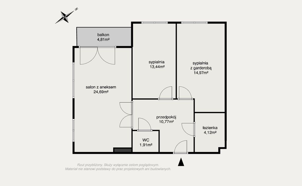 - salon z aneksem kuchennym (24,69 m2) z wyjściem na balkon (4,81 m2),