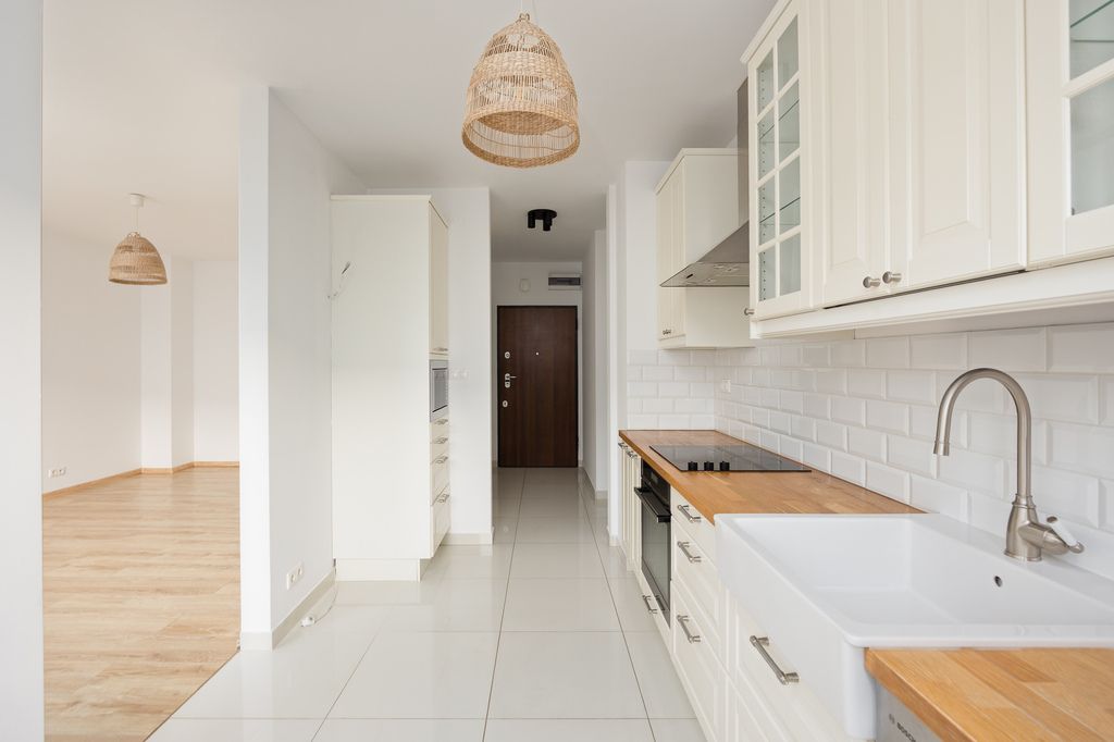 Kuchnia w zabudowie została w wyposażona w sprzęty AGD, m.in.: zmywarkę, piekarnik, mikrofalówkę oraz okap. Do mieszkania przynależą dwa miejsca postojowe w garażu podziemnym, każde dodatkowo płatne 45.000 zł. Mieszkanie dostępne od zaraz.