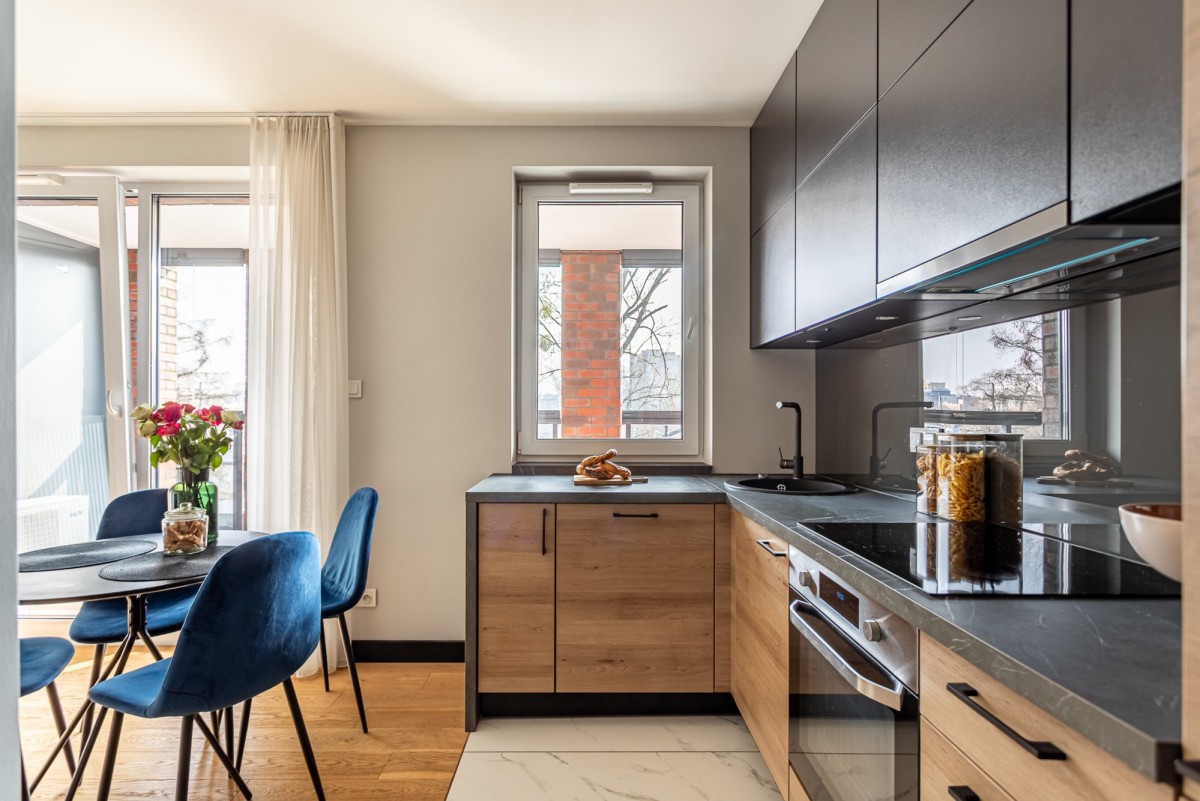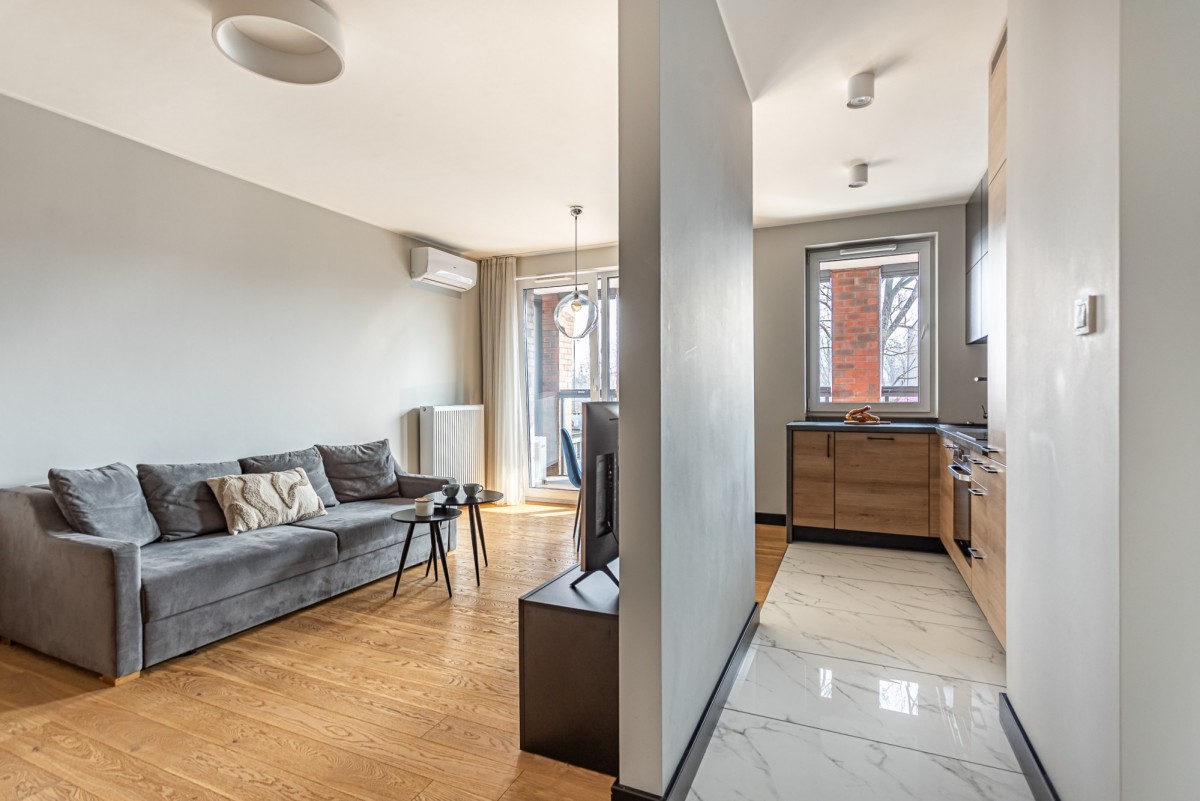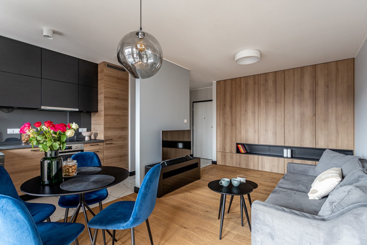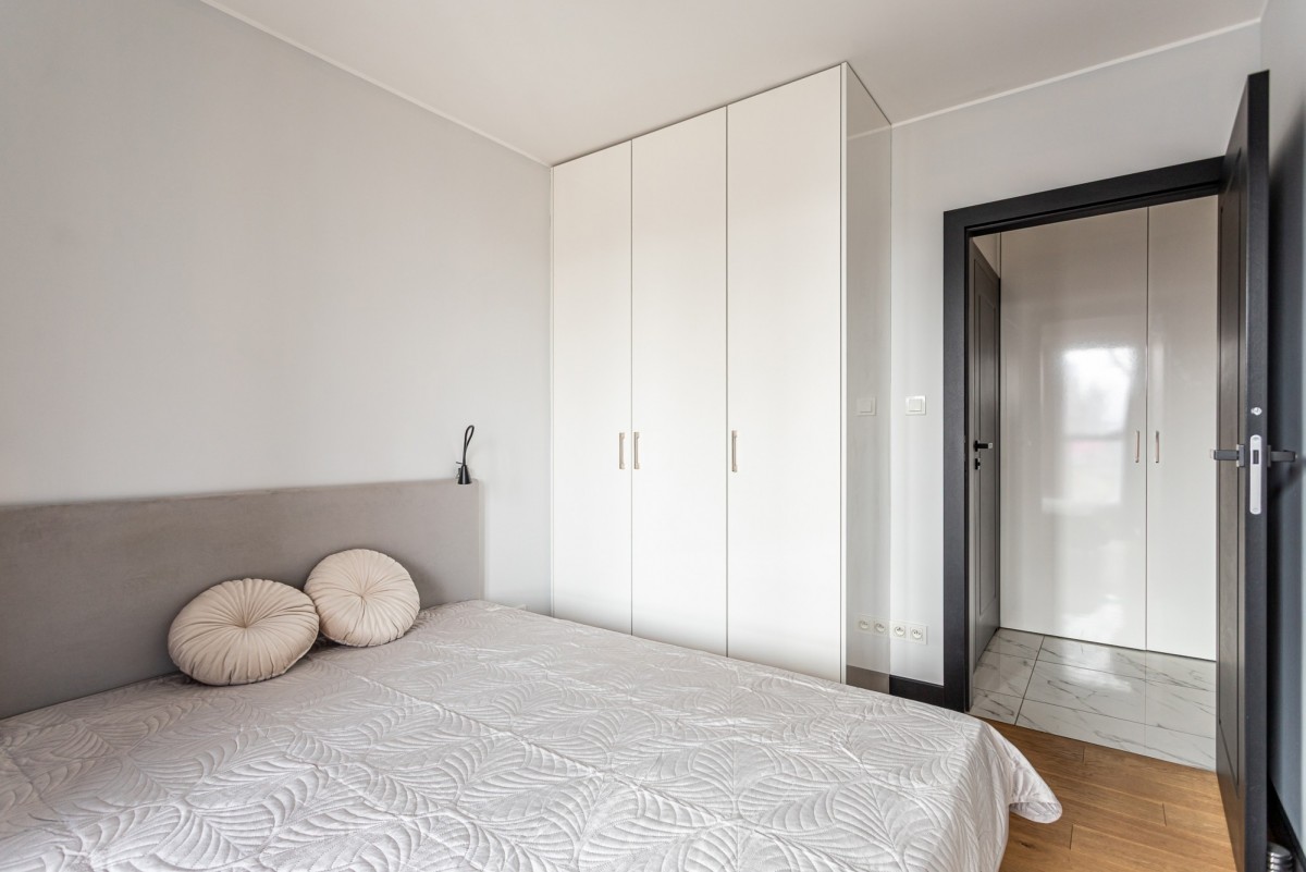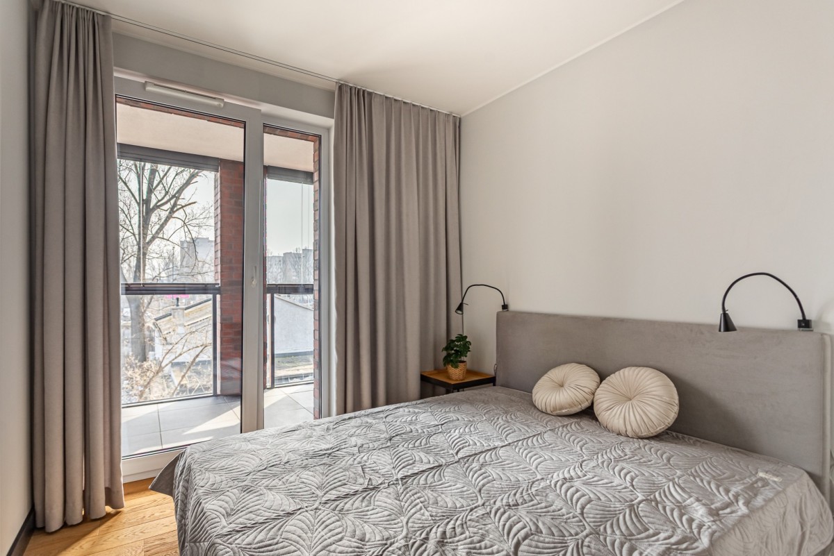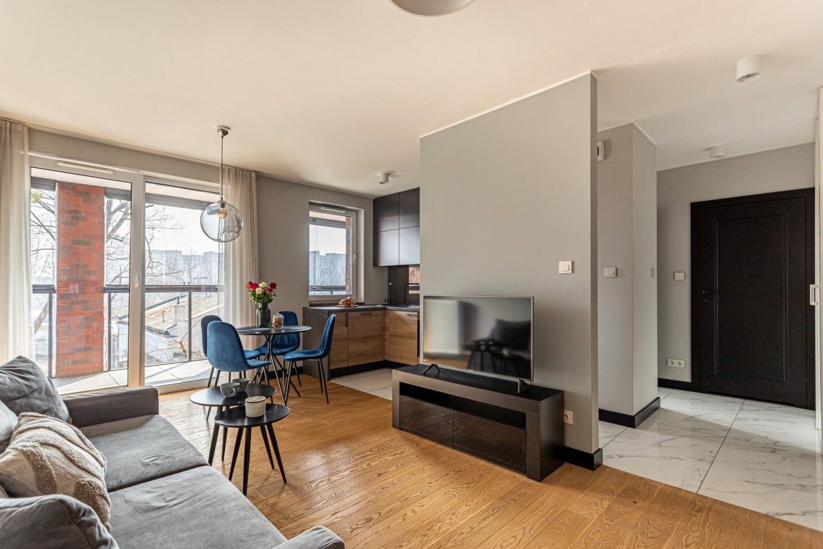 Nowoczesny, komfortowy dwupokojowy apartament na sprzedaż na drugim piętrze kameralnej inwestycji. Nieruchomość wyróżnia się panoramicznymi oknami, które zapewniają doskonałe doświetlenie wnętrz, oraz przestronnym balkonem o powierzchni 12.45 m², dostępnym zarówno z salonu, jak i sypialni.  Jest w pełni wyposażony w meble oraz sprzęty RTV i AGD, co pozwala na natychmiastowe zamieszkanie bez dodatkowych nakładów.