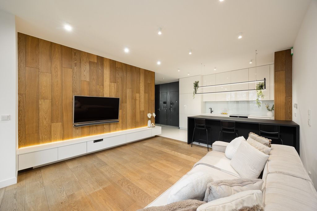 Mieszkanie wykończone w wysokim standardzie, gotowe do wprowadzenia, zaprojektowane przez architekta z dbałością o funkcjonalność i spójną estetykę wnętrz. Podłogi oraz fragmenty ścian wykończono naturalną deską dębową, nadając wnętrzu ponadczasowy charakter. Wysokość pomieszczeń wynosząca 275 cm zapewnia poczucie przestrzeni i komfortu.