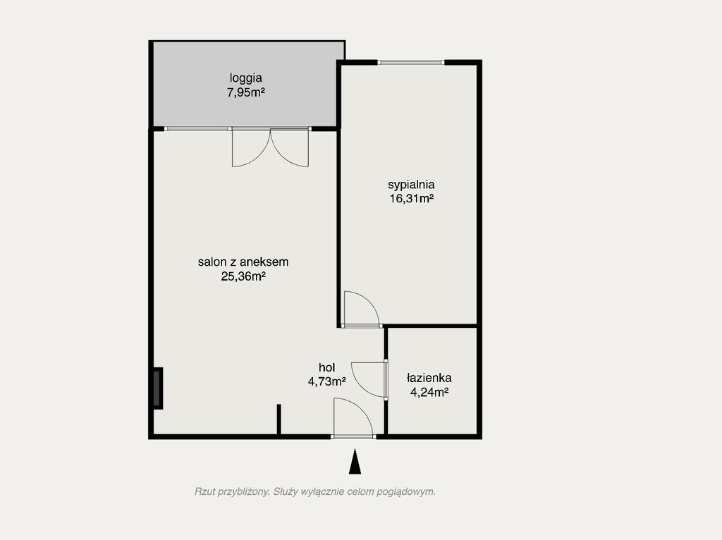 - salon z aneksem kuchennym (25,36 m²) z wyjściem na zadaszoną loggię (8,27 m²),