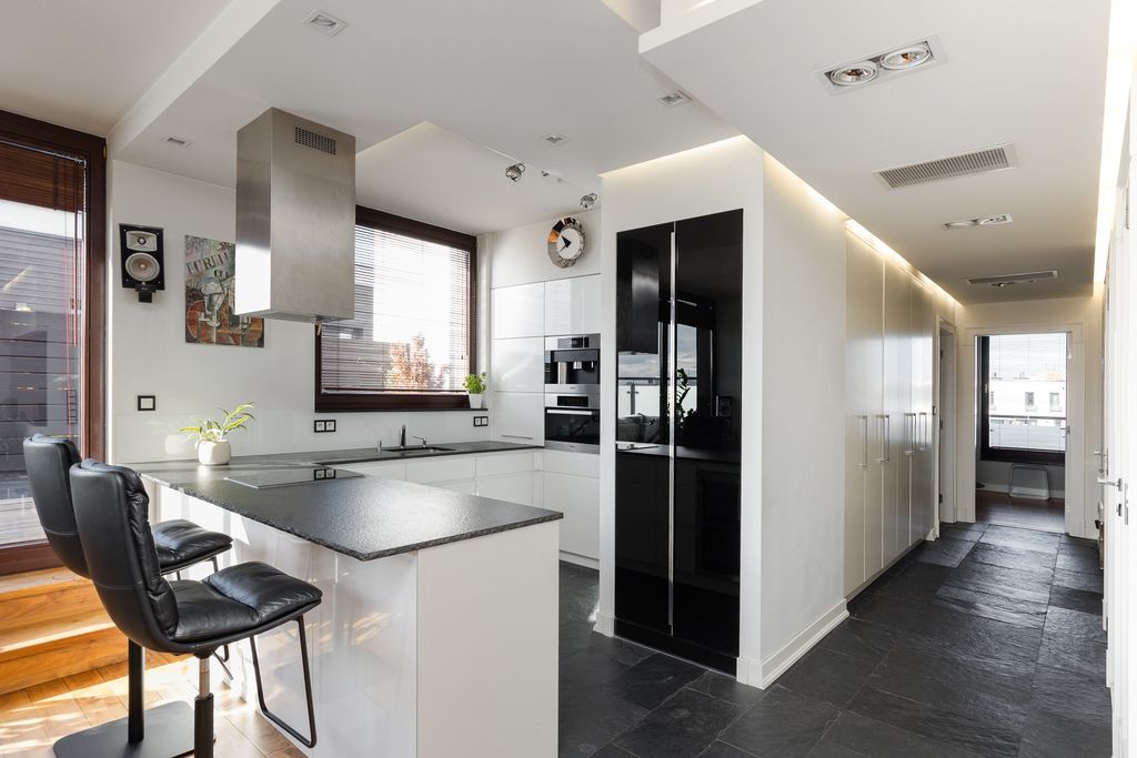 Apartament został zaprojektowany przez architekta z dbałością o każdy szczegół. Wszystkie zabudowy meblowe wykonano na wymiar, z materiałów wysokiej klasy.