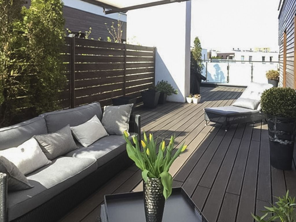 A 55 m² terrace with views over Oś Królewska and the landscaped courtyard