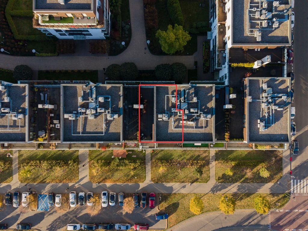 55-metrowy taras zapewnia ciszę, prywatność i przyjemny widok na Oś Królewską oraz zielone, zadbane patio. Wyposażony w oświetlenie i automatyczną markizę, stanowi funkcjonalne przedłużenie przestrzeni dziennej.