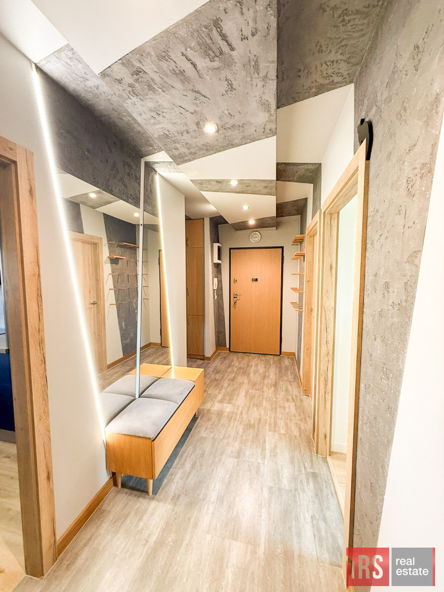 W przedpokoju znajduje się szafa wykonana na wymiar, podobnie jak meble w całym mieszkaniu - wszystko zaprojektowane z myślą o maksymalnym wykorzystaniu przestrzeni i estetyce.