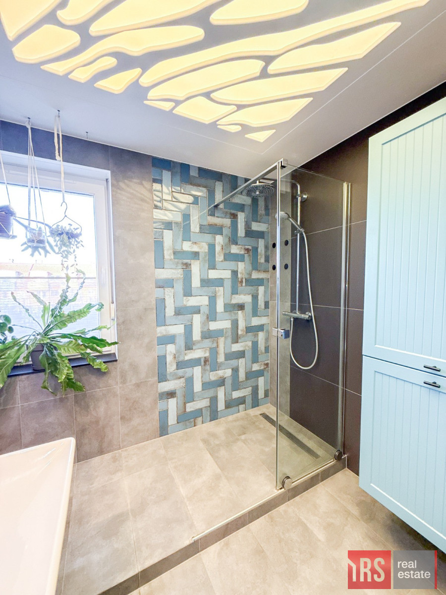 Duża, elegancka łazienka z kabiną prysznicową, urządzona w nowoczesnym stylu.