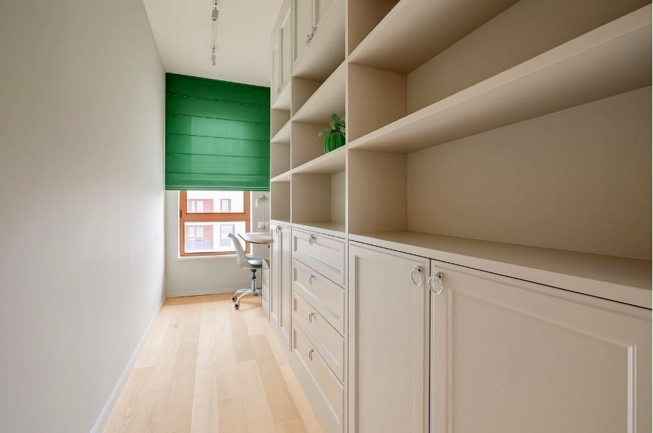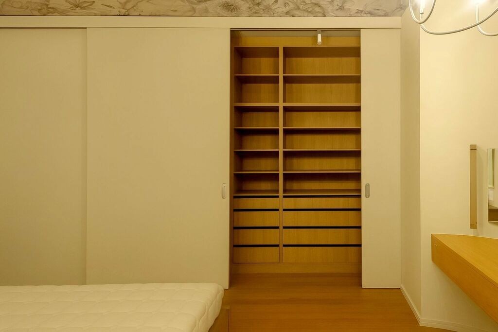 - korytarz z dużymi, wbudowanymi szafami i hol komunikacyjny
