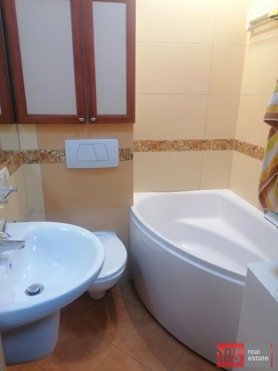 - W łazience wanna, umywalka, pralka i szafka na kosmetyki